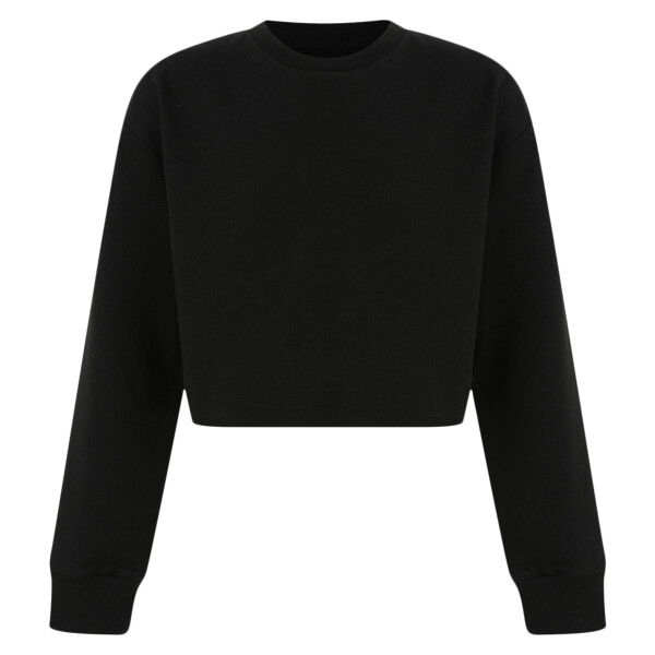 Tear-out label. Oversized sweatshirt with cropped raw hem. Set-in sleeves, with dropped shoulders. 2x2 ribbed neck and cuffs. Single Jersey back neck tape.