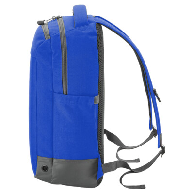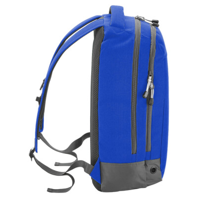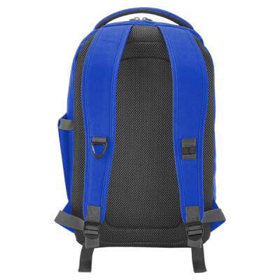 Water-resistant fabric. Wide zip opening for easy access. Front pocket organiser section. Internal slip pocket. External bottle pocket. Secure wireless headphone holder. Easy-access attachment clip. Metal ventilation eyelets. Breathable padded mesh back panel. Ergonomically designed straps for everyday comfort. Padded grab handle. TearAway label for ease of rebranding.