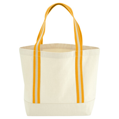Contains 100% certified organic cotton. Premium, heavyweight fabric. Soft cotton, striped webbing handles. Can be carried by hand or over the shoulder.