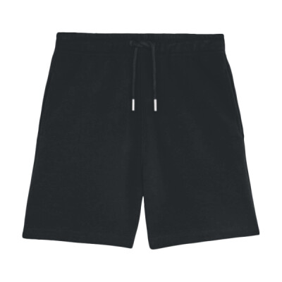 Kids jogger shorts. Self-fabric elastic waistband and round drawcords in matching body colour with metal tipping. Embroidered eyelets. Pockets at front. Patch pocket at back. Bottom hem with wide double-needle topstitch.