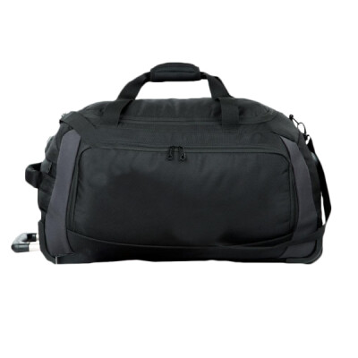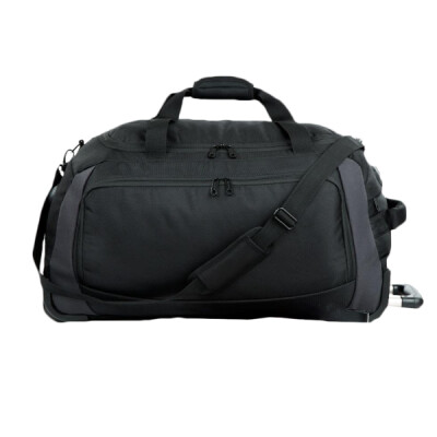 Zippered side pocket, multiple internal pockets, retractable tow handle, detachable adjustable shoulder strap with pad and heavy duty wheels.