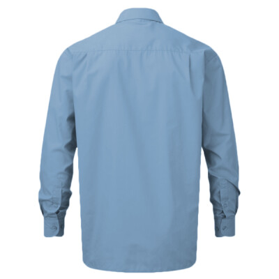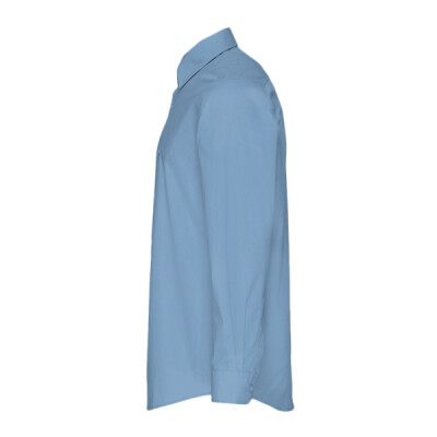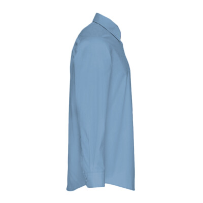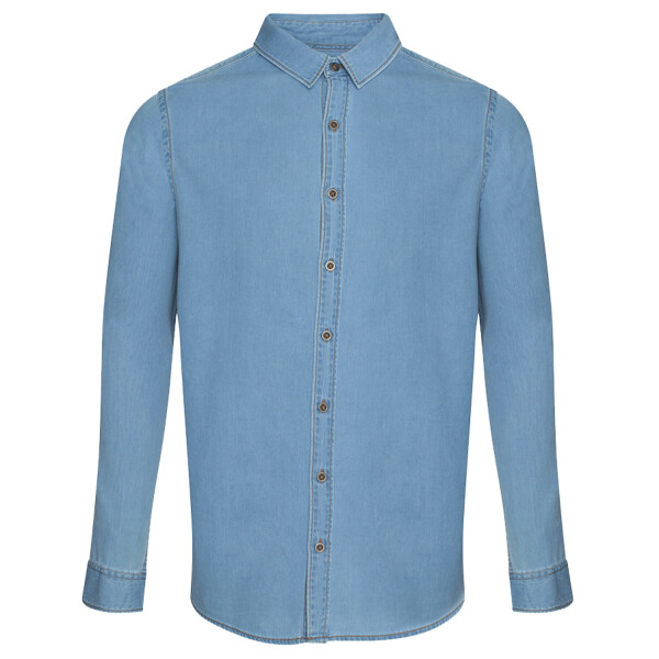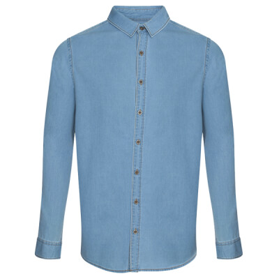 Classic long sleeve light weight denim shirt. Features include front button placket, button detail at cuffs and back yoke. Satin weave. Turned hem with single needle stitch detail. Fashion fit. Single needle contrast at armholes collar and front placket. 2 button placket at cuff. Button placket centre front fastening. Modern narrow collar. Yoke at back shoulder. No pockets for maximum embellishment area.